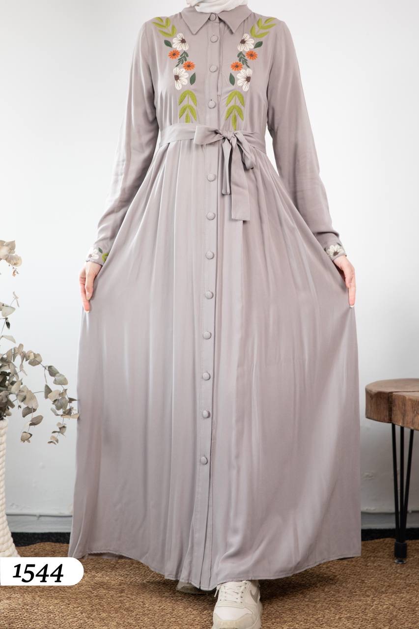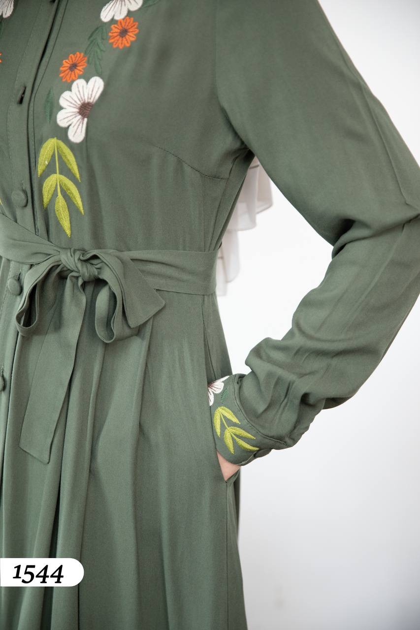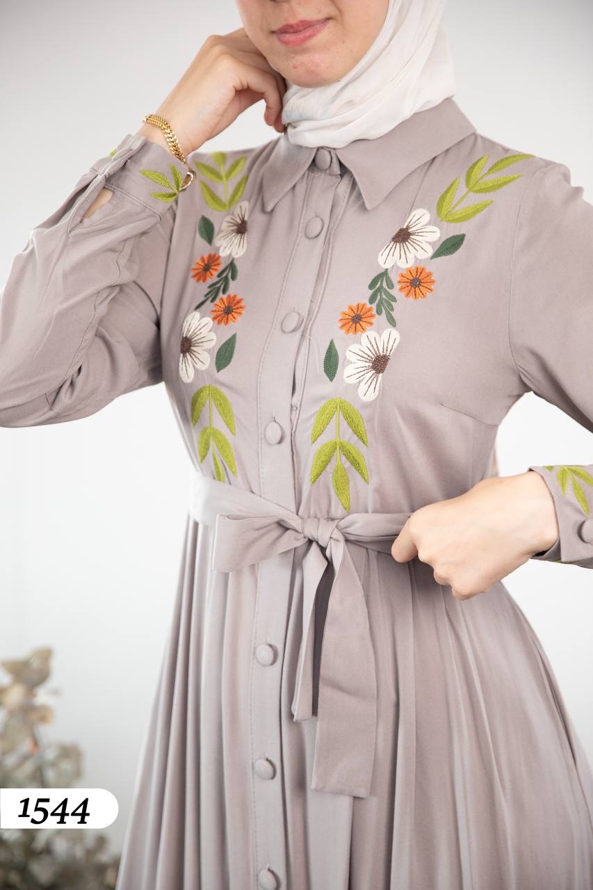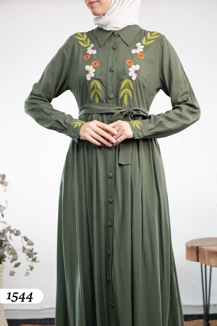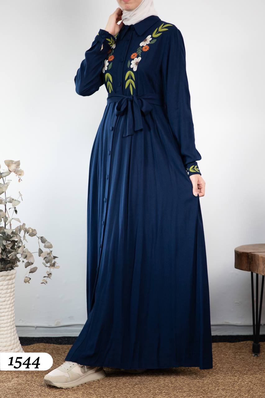 Robe féminine en tissu Jilick léger 🌿, avec broderie florale sur le buste et aux extrémités des manches et boutons sur le devant du haut jusqu’en bas. Sa coupe ample et fluide assure confort et élégance.