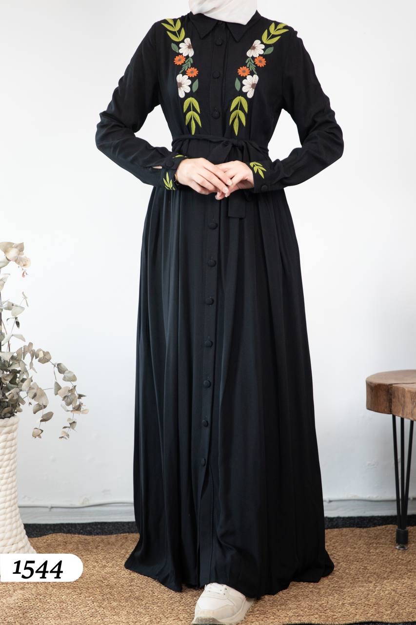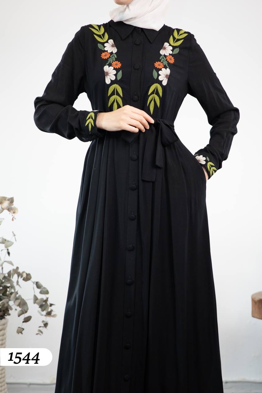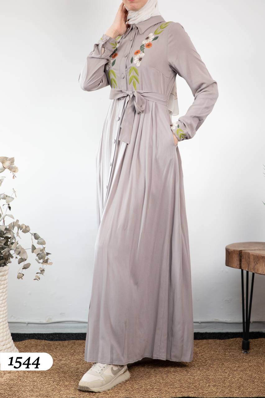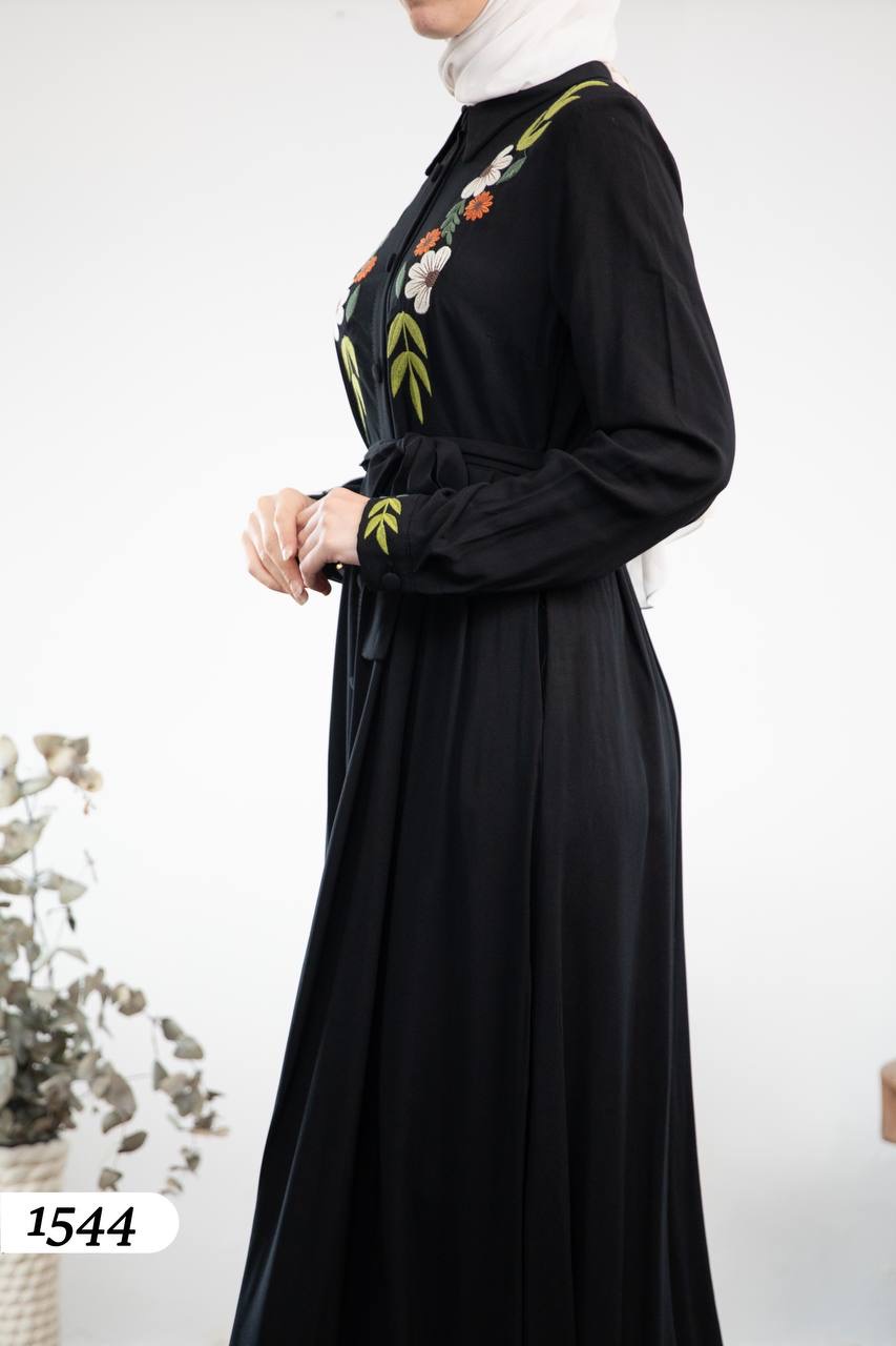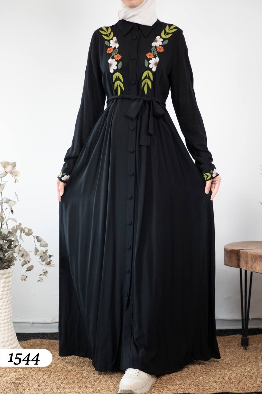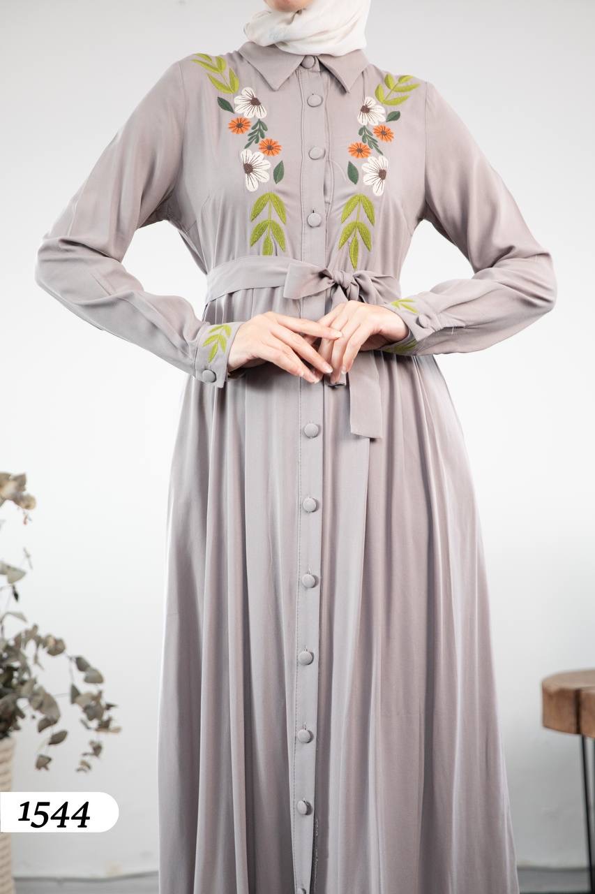 Robe féminine en tissu Jilick léger 🌿, avec broderie florale sur le buste et aux extrémités des manches et boutons sur le devant du haut jusqu’en bas. Sa coupe ample et fluide assure confort et élégance.
