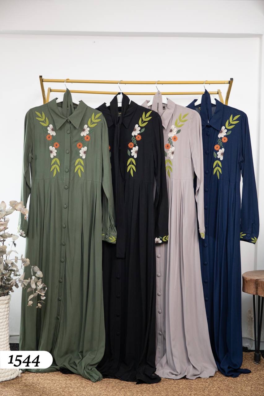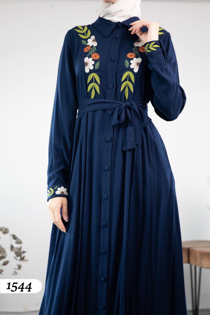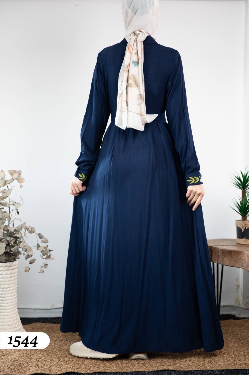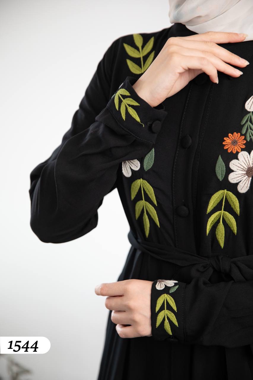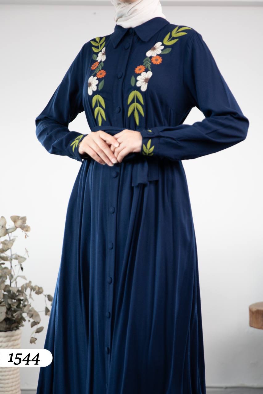 Robe féminine en tissu Jilick léger 🌿, avec broderie florale sur le buste et aux extrémités des manches et boutons sur le devant du haut jusqu’en bas. Sa coupe ample et fluide assure confort et élégance.
