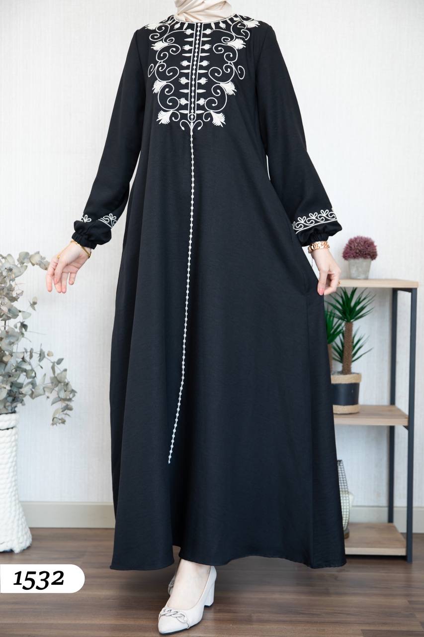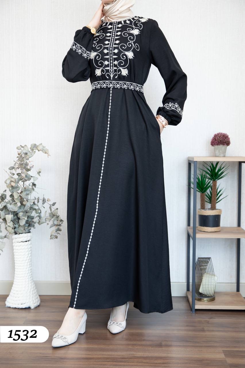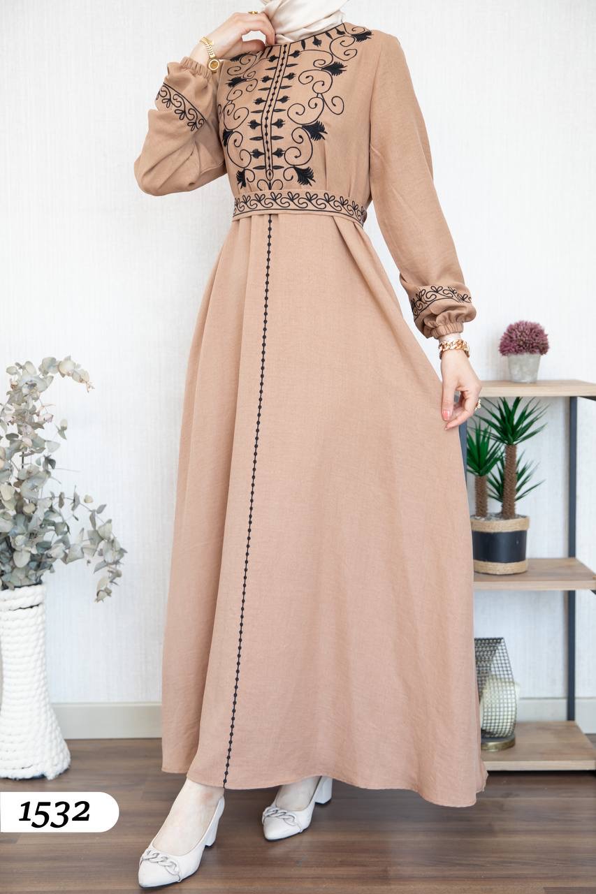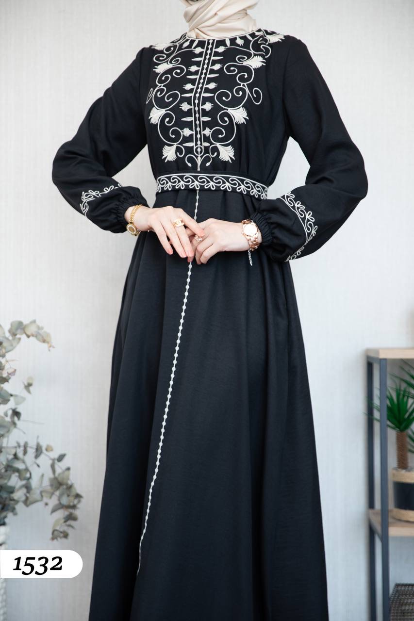 Robe élégante en lin mélangé, légère et confortable 🌿. Elle se distingue par une broderie noire à l’avant et aux extrémités des manches.