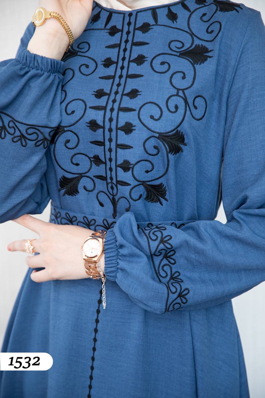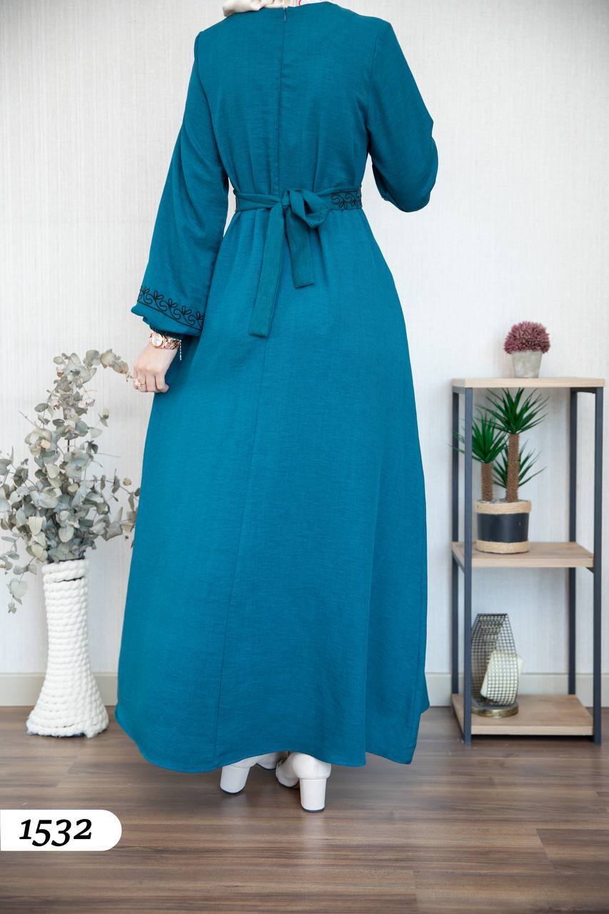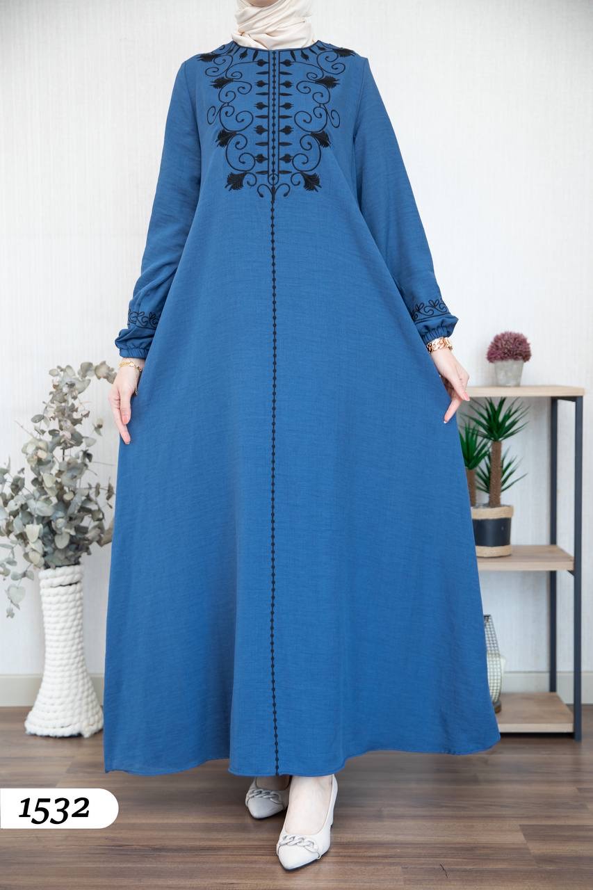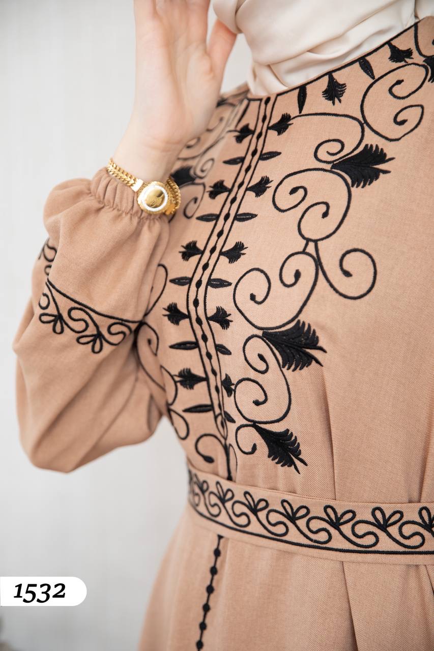 Robe élégante en lin mélangé, légère et confortable 🌿. Elle se distingue par une broderie noire à l’avant et aux extrémités des manches.