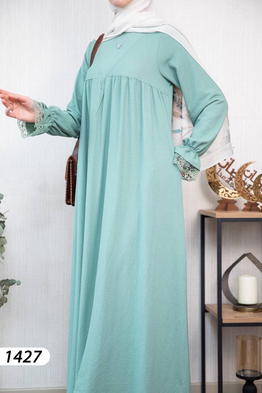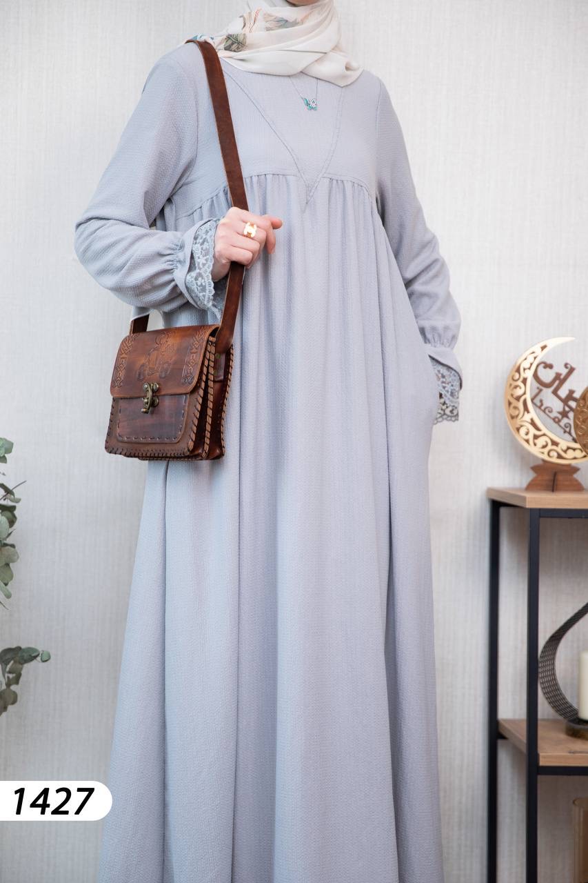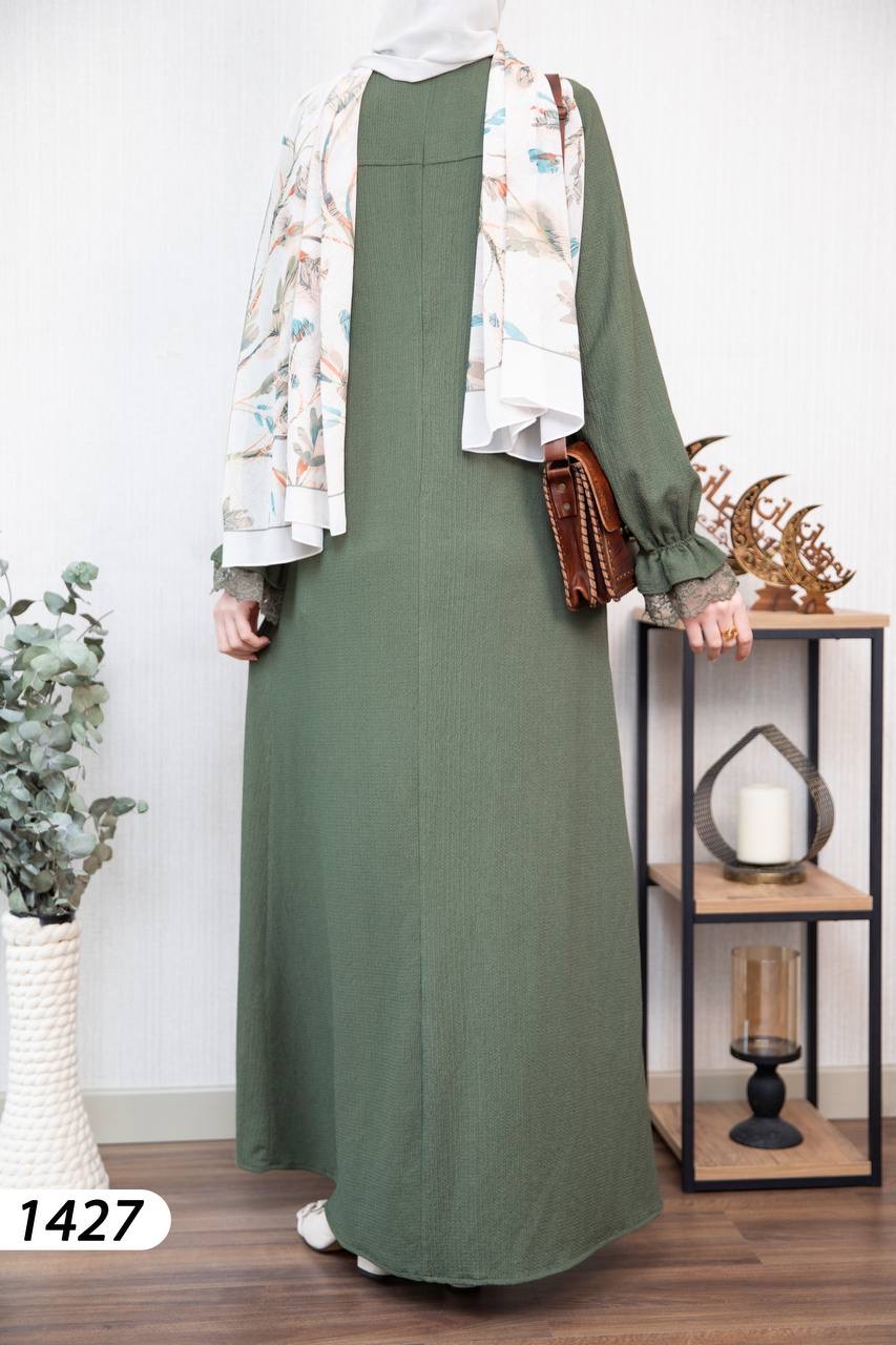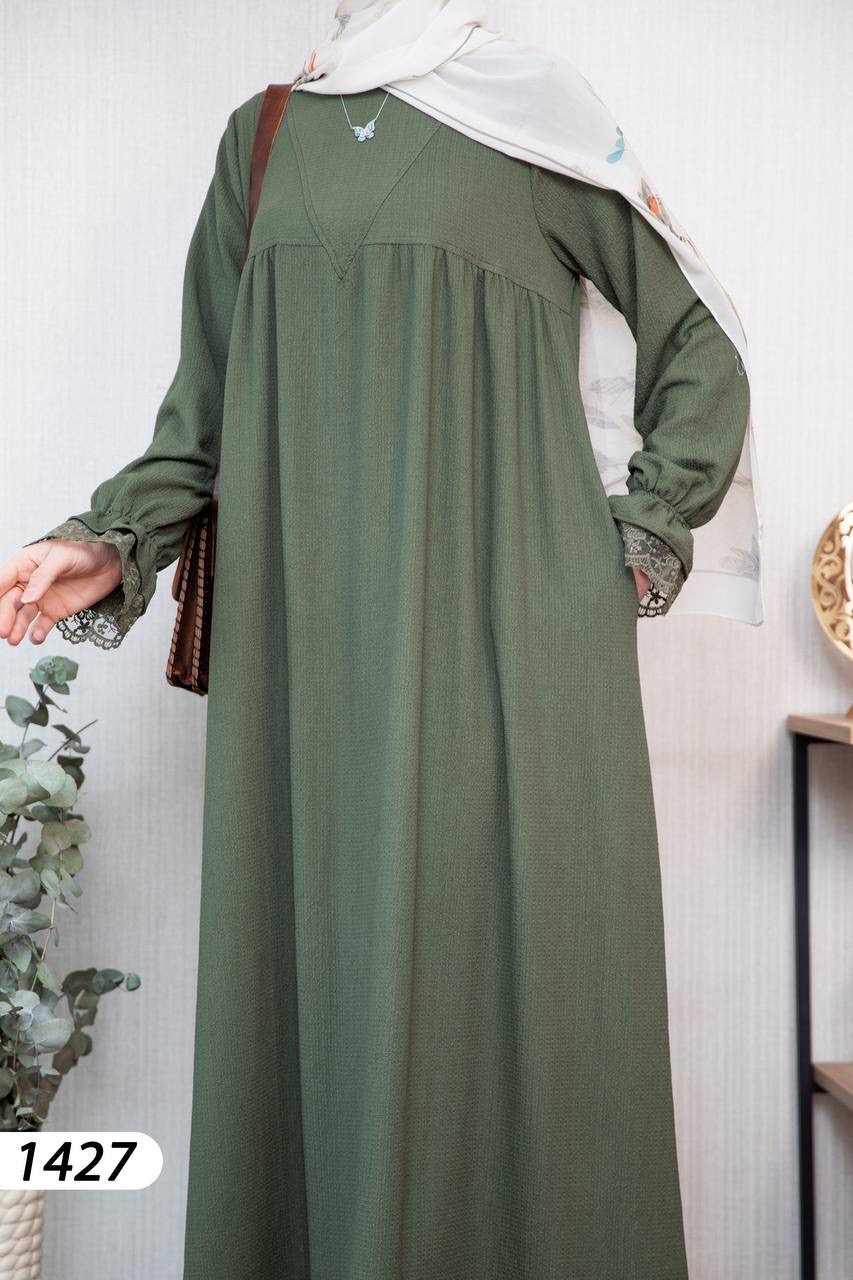 Robe élégante et confortable en tissu Borujouk lin, légère et agréable à porter 🌿. Elle se distingue par des détails en dentelle raffinée aux extrémités des manches, apportant une touche féminine et délicate. Sa coupe large et fluide offre confort et élégance au quotidien, idéale pour les femmes voilées.