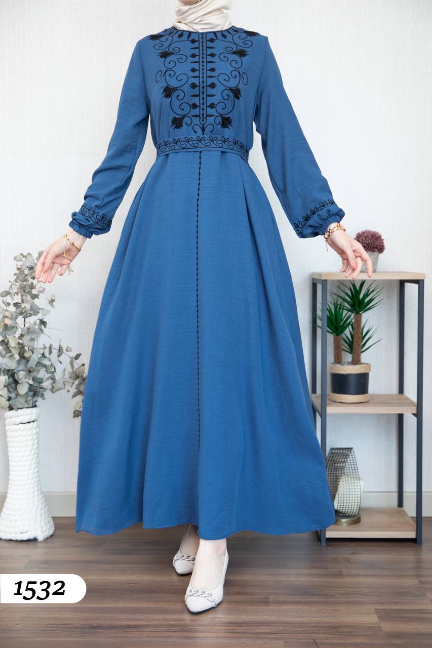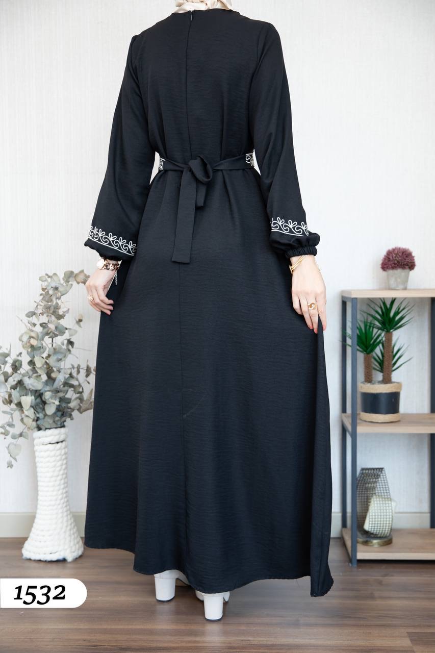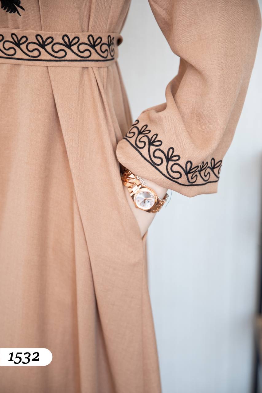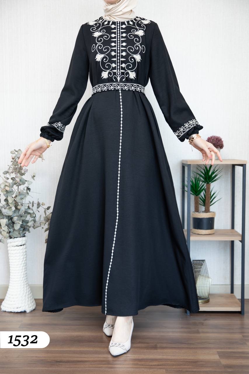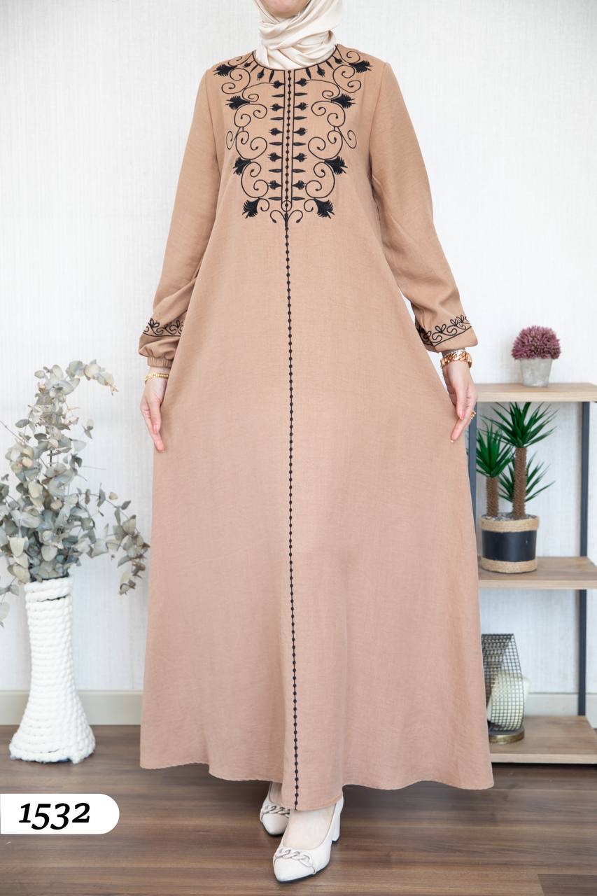 Robe élégante en lin mélangé, légère et confortable 🌿. Elle se distingue par une broderie noire à l’avant et aux extrémités des manches.