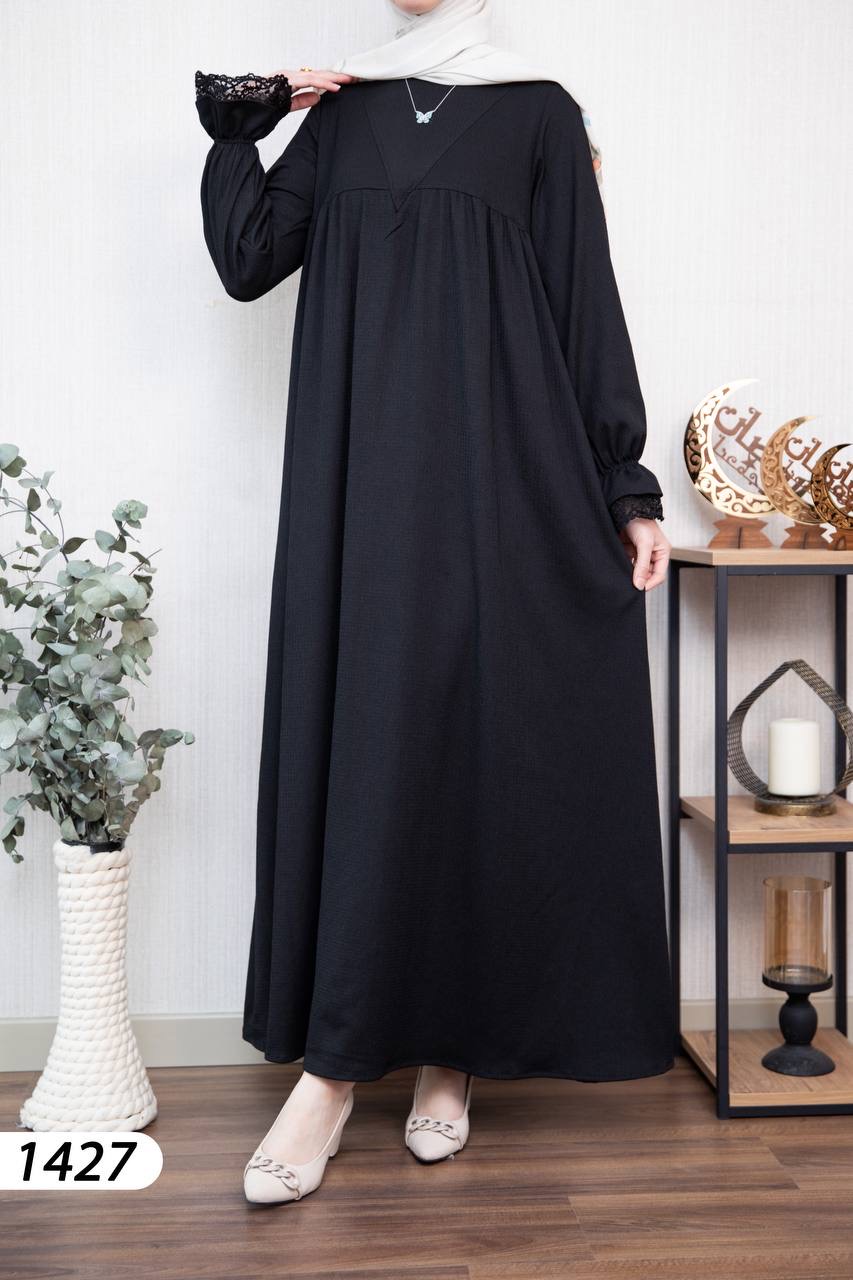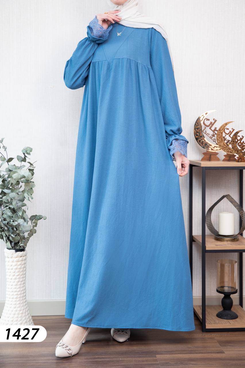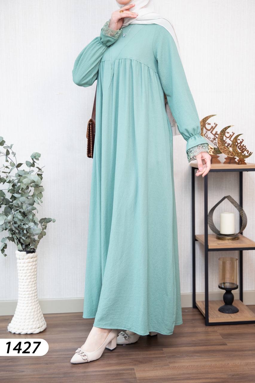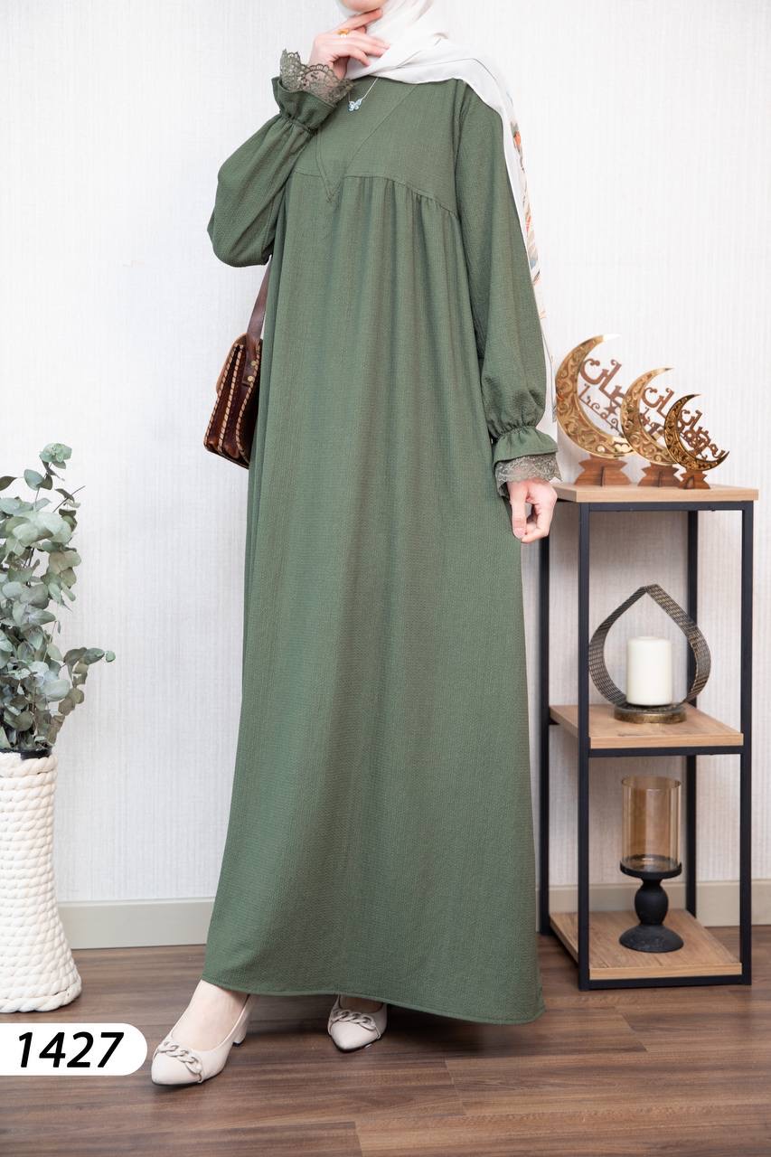 Robe élégante et confortable en tissu Borujouk lin, légère et agréable à porter 🌿. Elle se distingue par des détails en dentelle raffinée aux extrémités des manches, apportant une touche féminine et délicate. Sa coupe large et fluide offre confort et élégance au quotidien, idéale pour les femmes voilées.